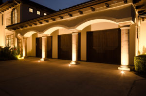 Frequently, we add lighting in hardscaping to light the front facade of homes and garage doors for safety and security.